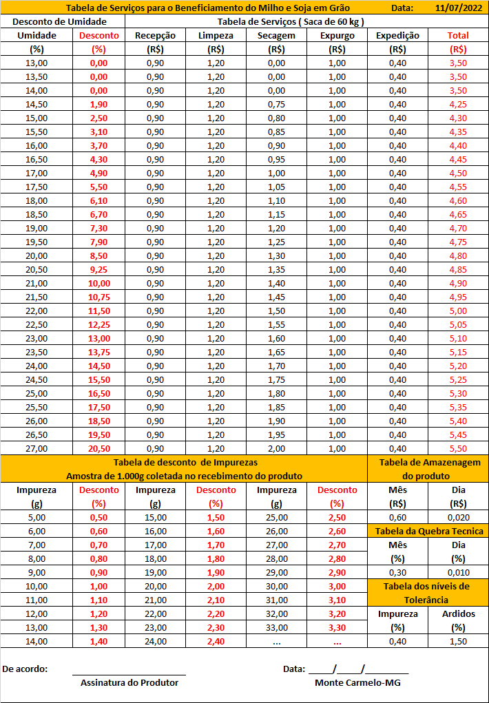 Tabela de serviços e descontos para o beneficiamento de grãos.