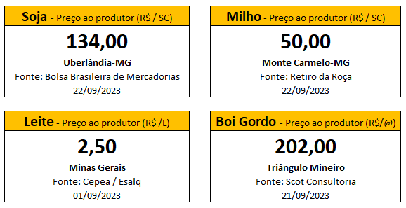 22/09/2023 – Cotação de Preços: Soja, Milho, Leite e Carne 22 de Setembro, 202322 de Setembro, 2023 Retiro da Roça Blog